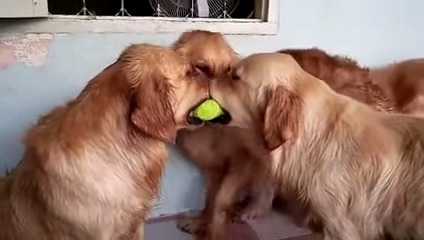 2匹のわんこに挟まれた飼い主さん。 画面左のわんこをなでなでしてい ...